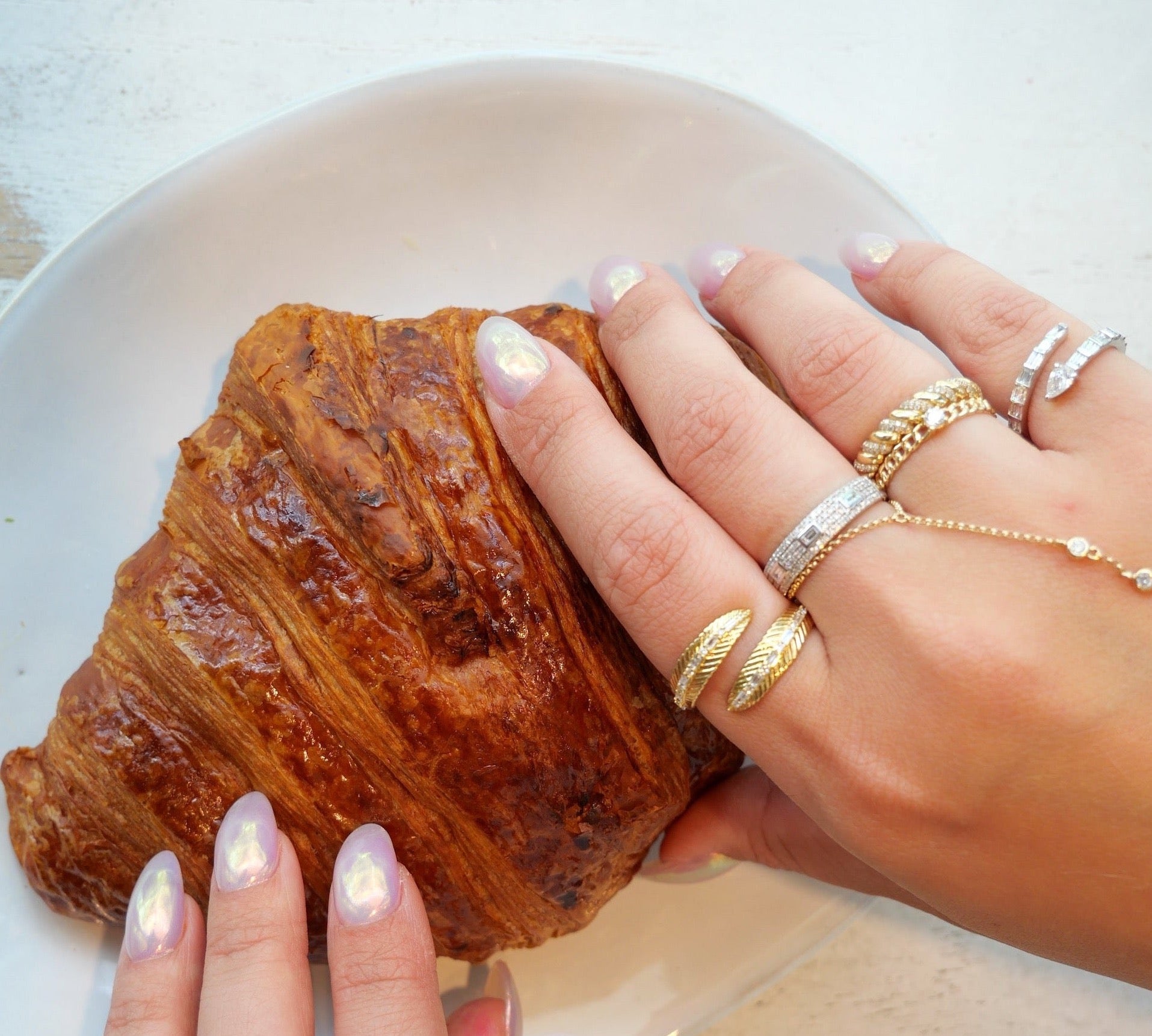 • Stacked pinky rings show playful creativity.