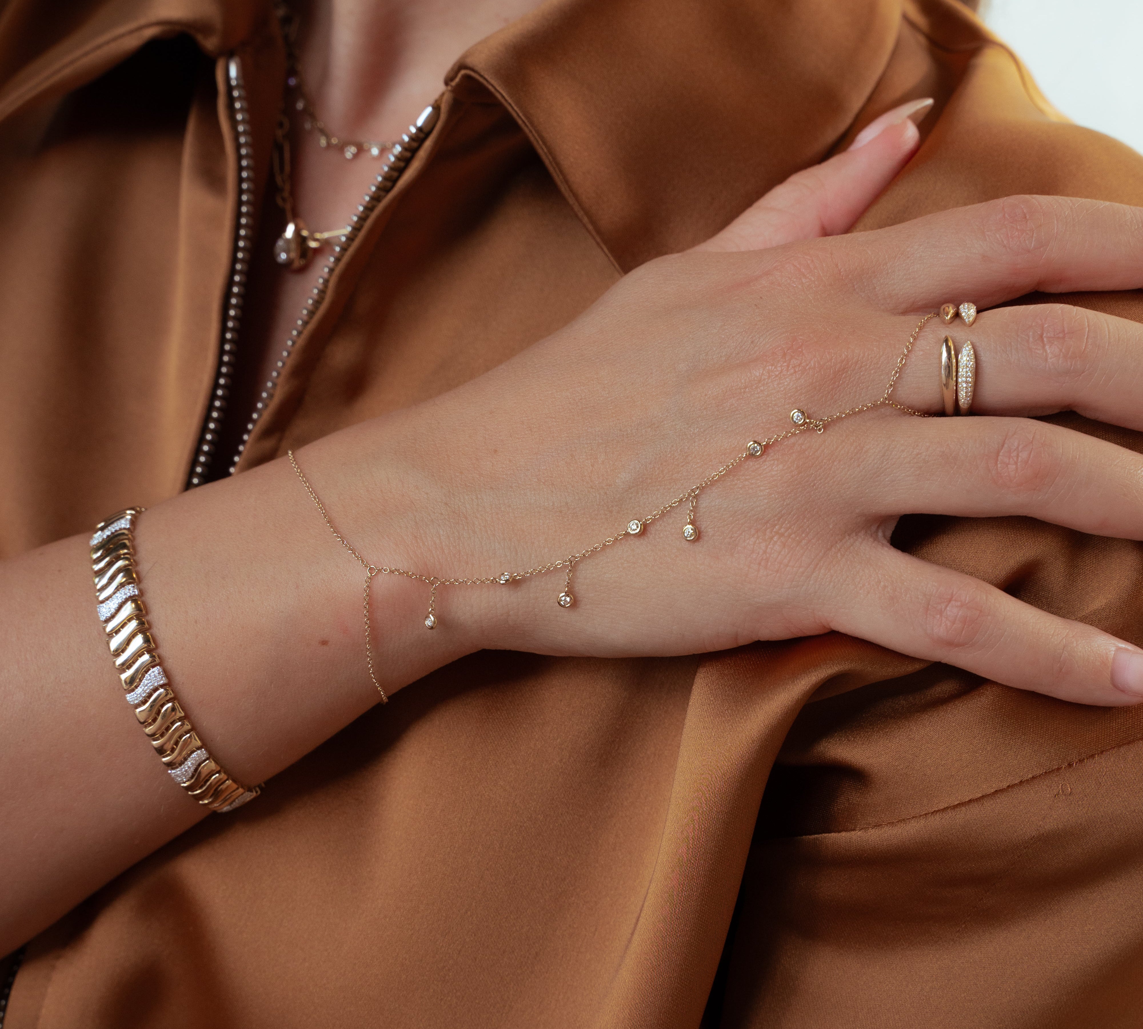 Monisha Melwani's Body Jewelry collection offers a stylish way to express yourself. Our collection includes body chains, hand bracelets, and waist chains, all crafted from high-quality gold and adorned with diamonds or gemstones. Explore our fine body jewelry collection today!