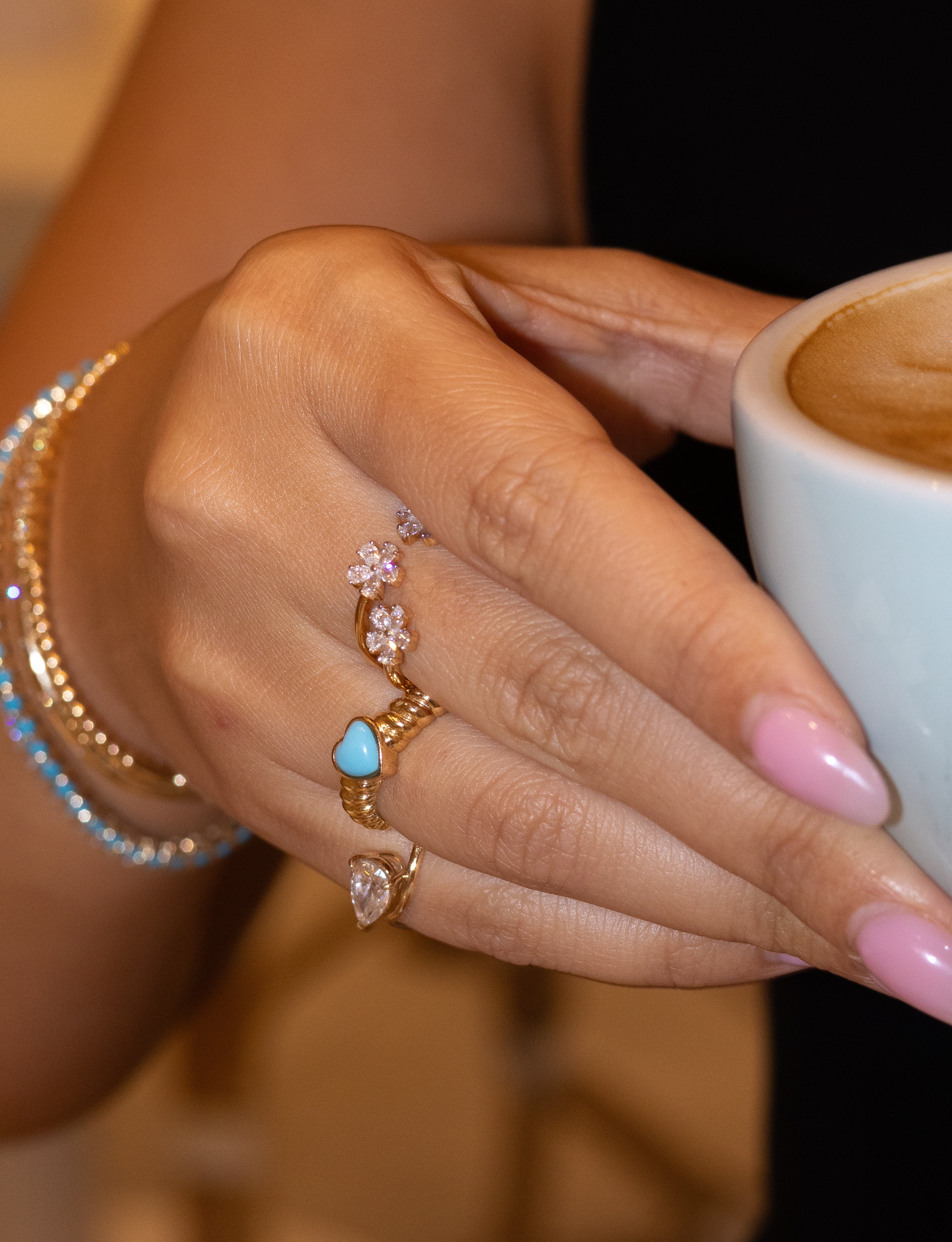 This Gold Turquoise Heart Twist Ring features turquoise set in 14k Yellow Gold.