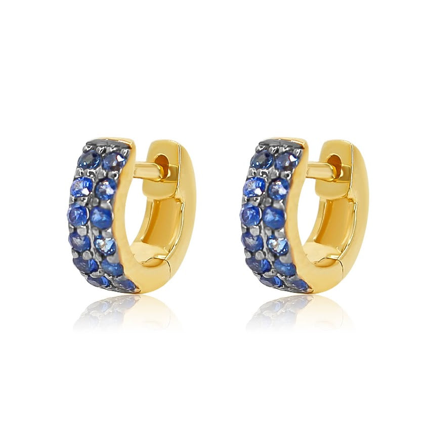 These Gold Blue Sapphire Double Line Mini Hoop Earring feature sapphires set in 14K yellow gold.
