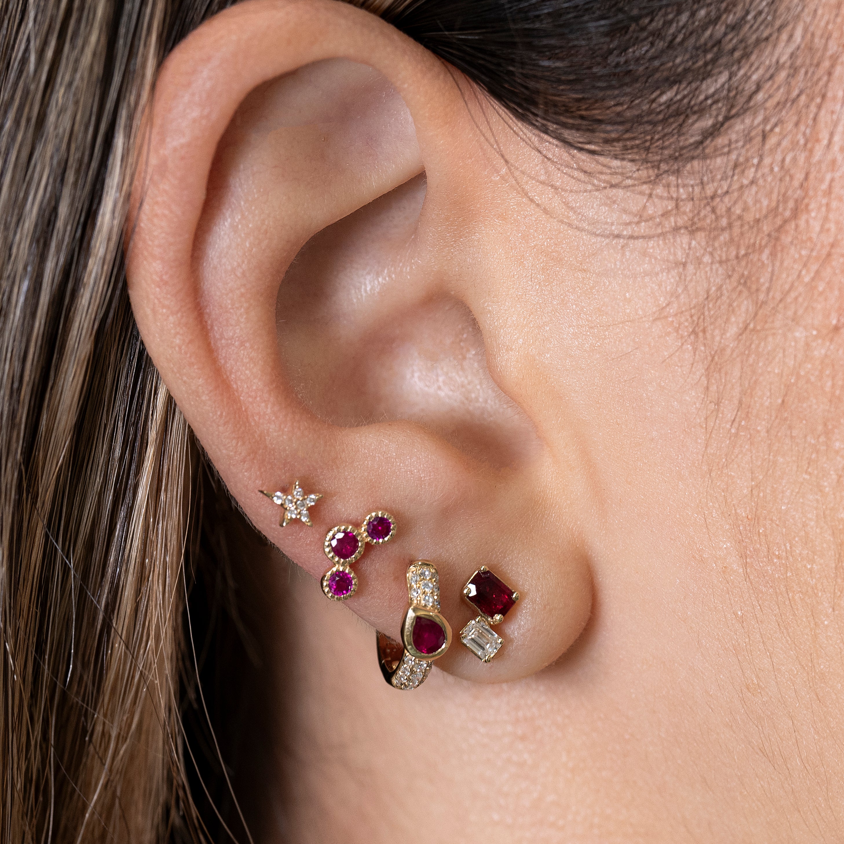 Gold Double Baguette Diamond and Ruby Earring Stud