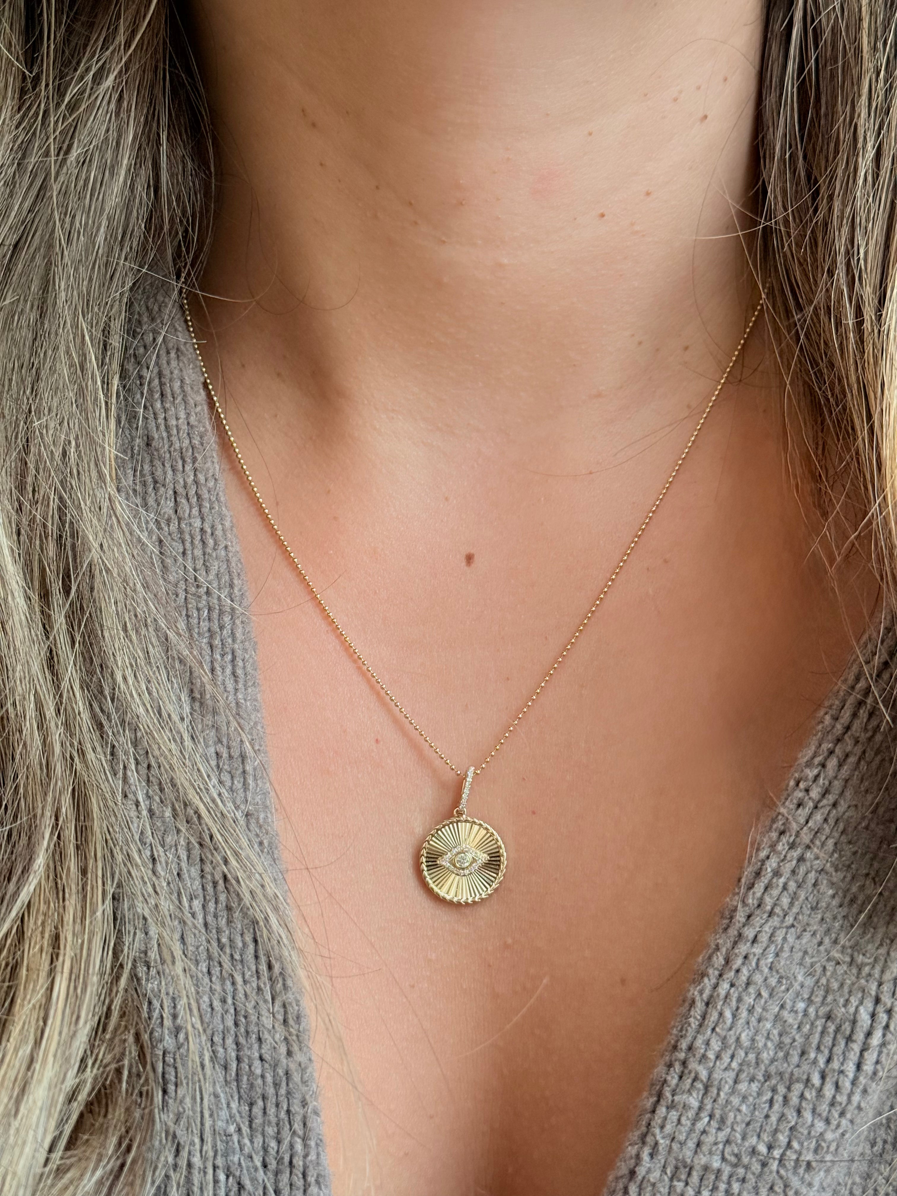 Crafted in polished 14k Yellow Gold, the round ribbed medallion catches the light beautifully, while a delicate diamond-set evil eye sits at the center — subtle, meaningful, and perfect for everyday wear.
