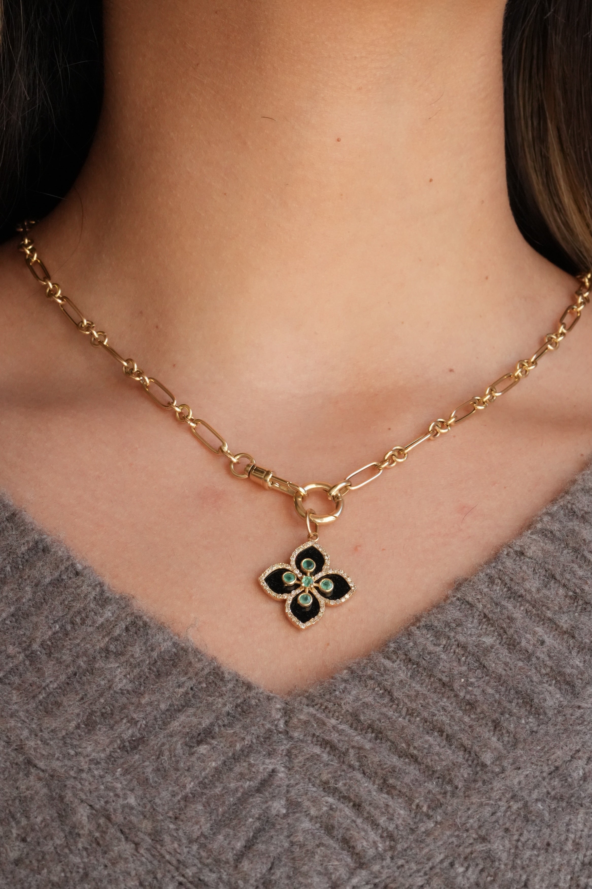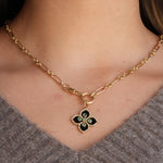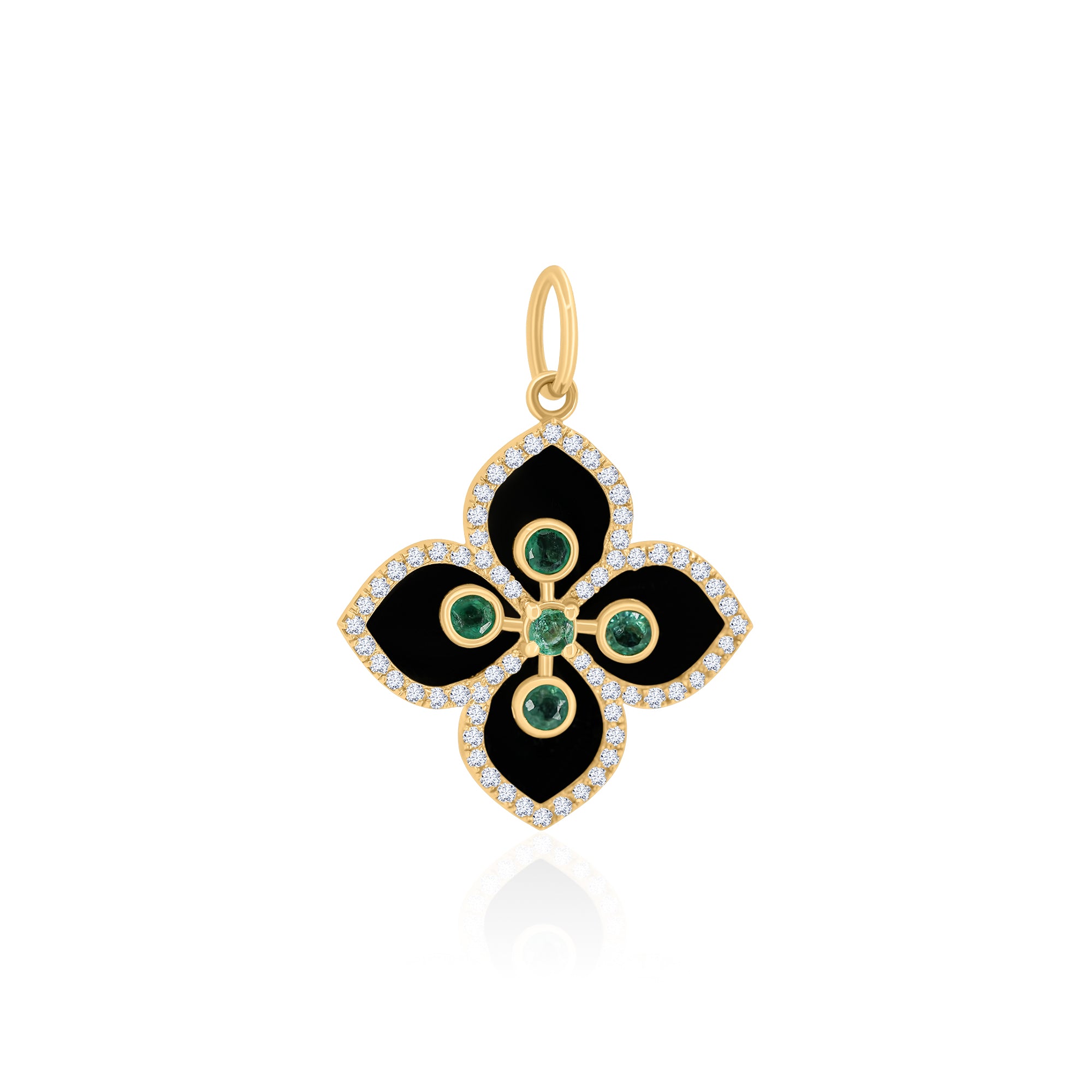 A striking symbol of luck and elegance, this black clover pendant is crafted in 14K yellow gold and detailed with brilliant diamonds and rich emerald accents. The bold contrast of black enamel with sparkling stones makes this piece a standout, perfect worn alone or layered for a modern, elevated look.