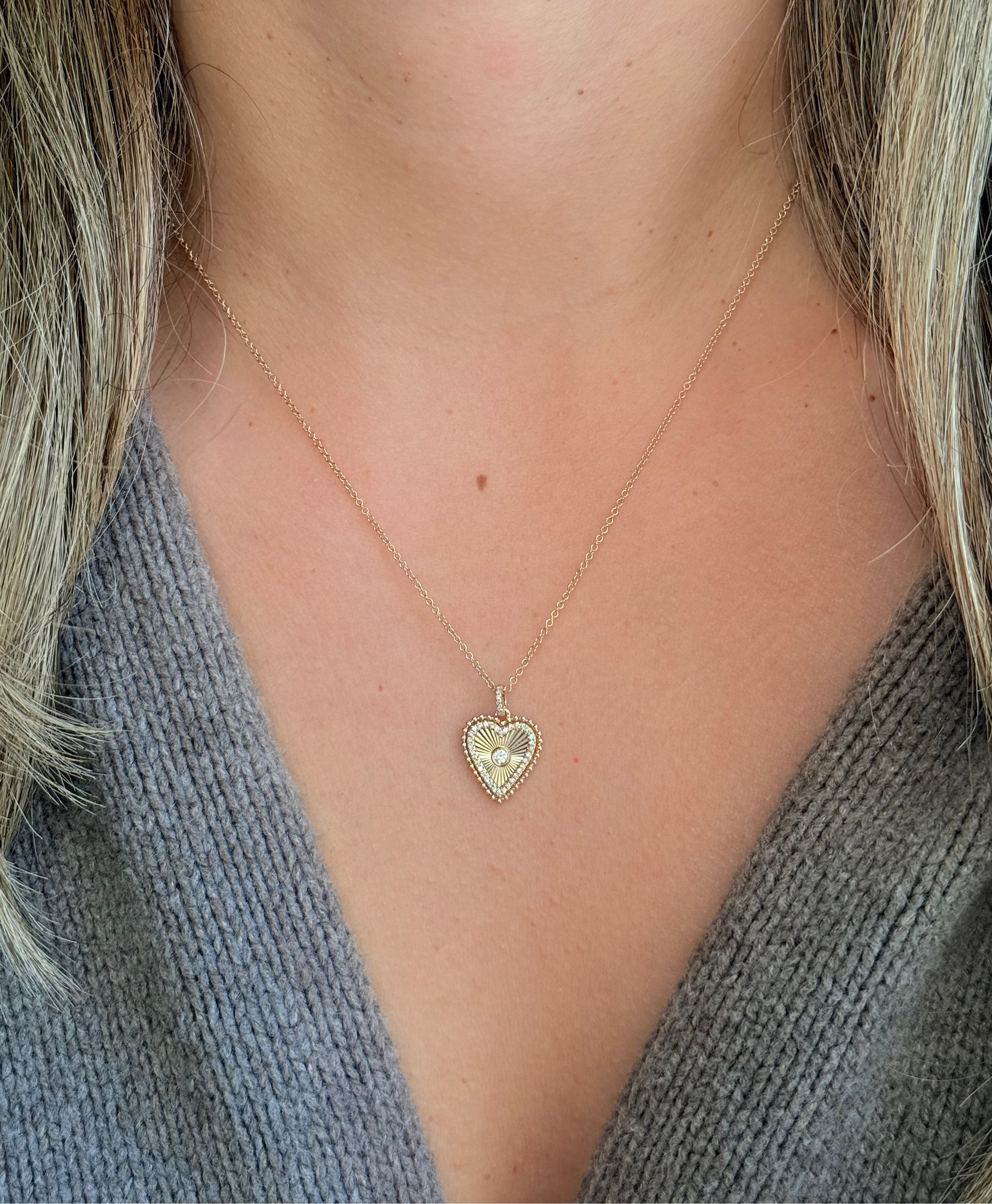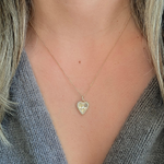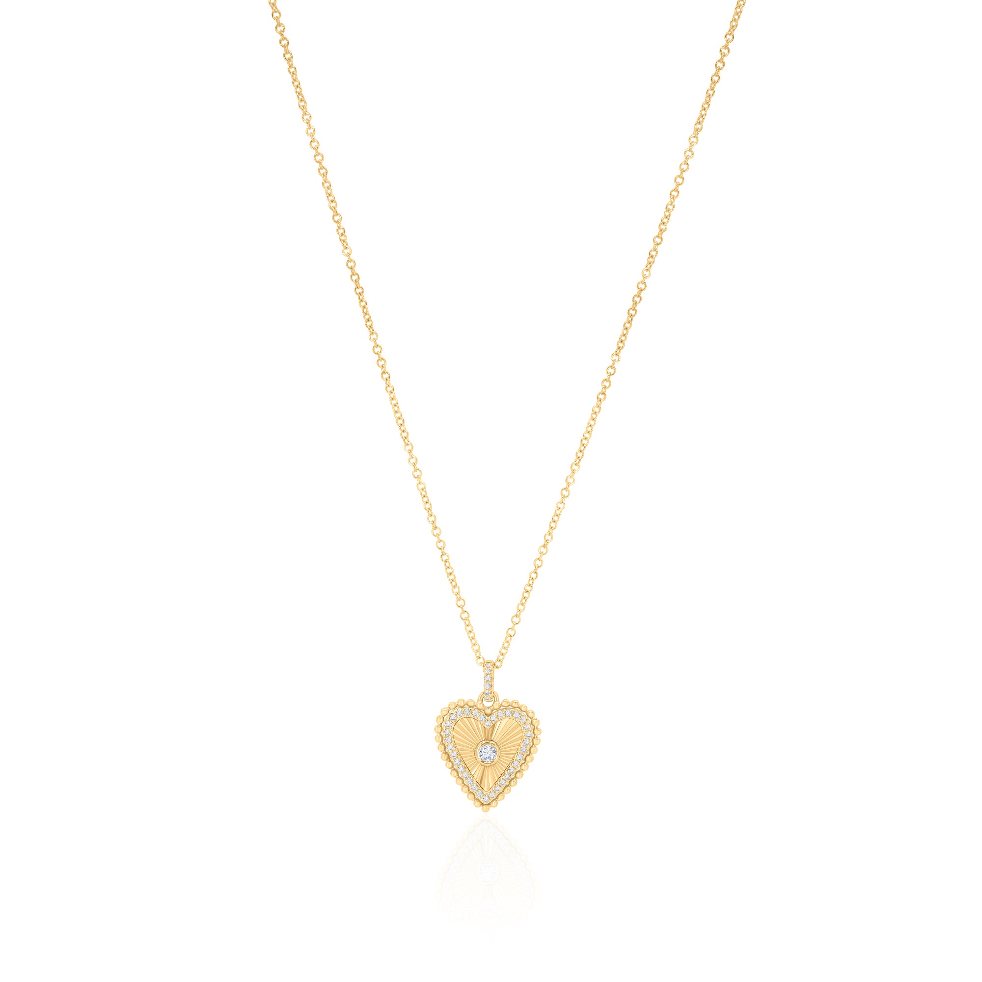 Our Gold Pave and Ribbed Diamond Heart Necklace brings together two MMJ signatures: soft ribbed gold detailing and a touch of gemstone sparkle. At the center sits a delicate heart outlined in pavé diamonds —subtle, meaningful, and easy for everyday wear.