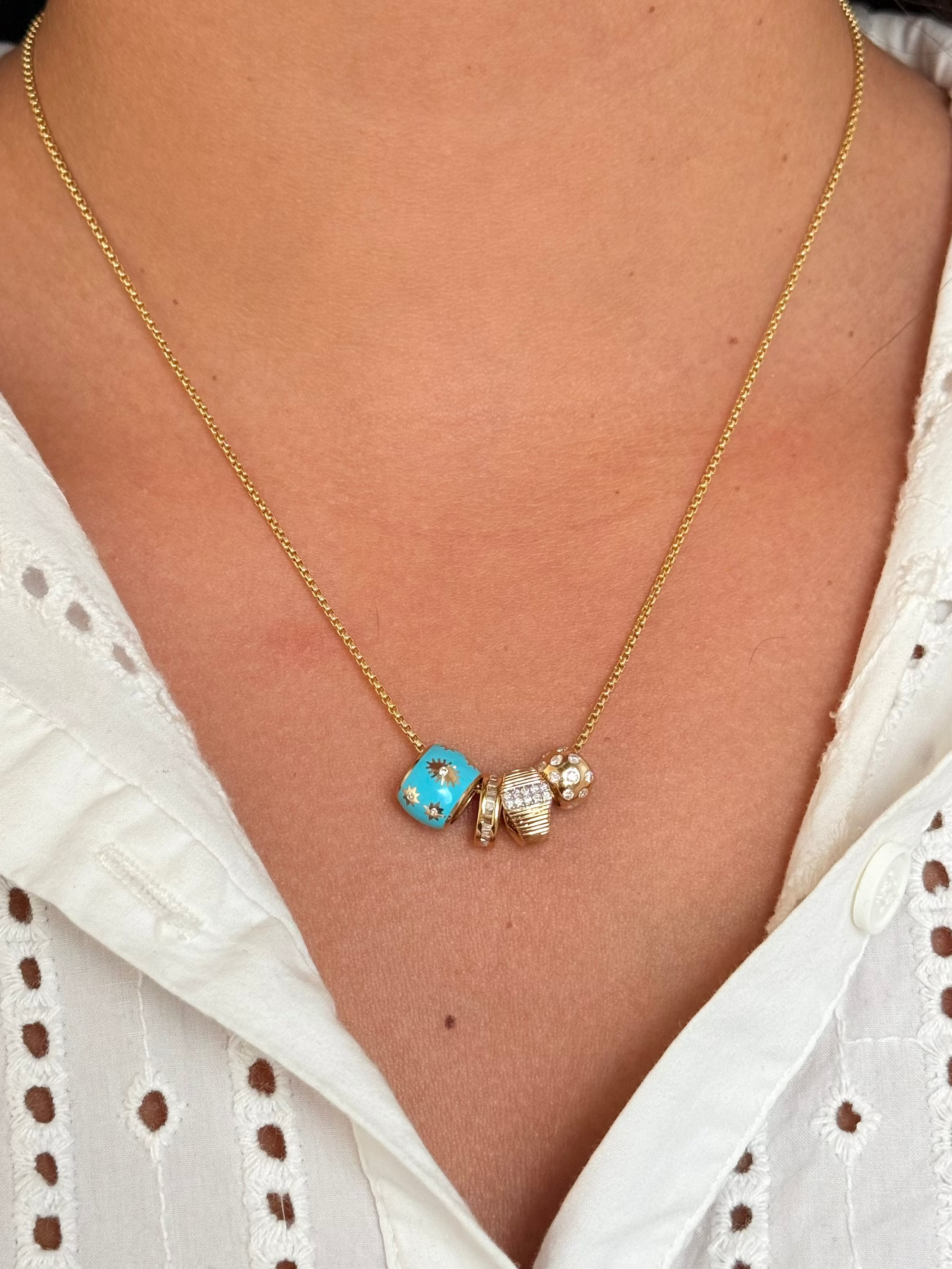 A vibrant turquoise enamel rondelle accented with diamond-set evil eyes in 14k yellow gold. Playful yet protective, it’s designed to add color, luck, and light to your everyday stack.