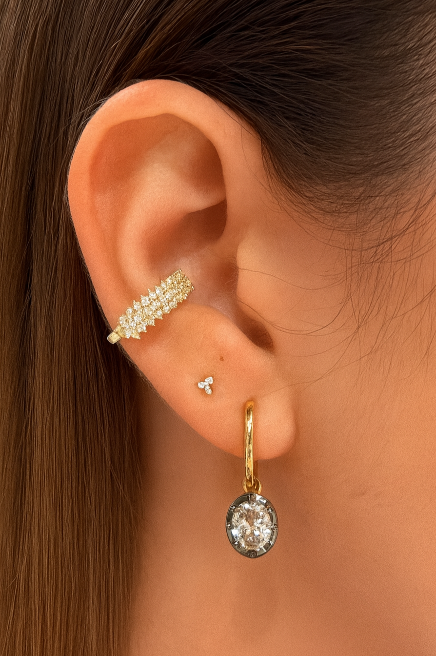 A bold mix of tones: oval lab-grown diamonds framed in black rhodium, hanging from 14k yellow gold hoops.