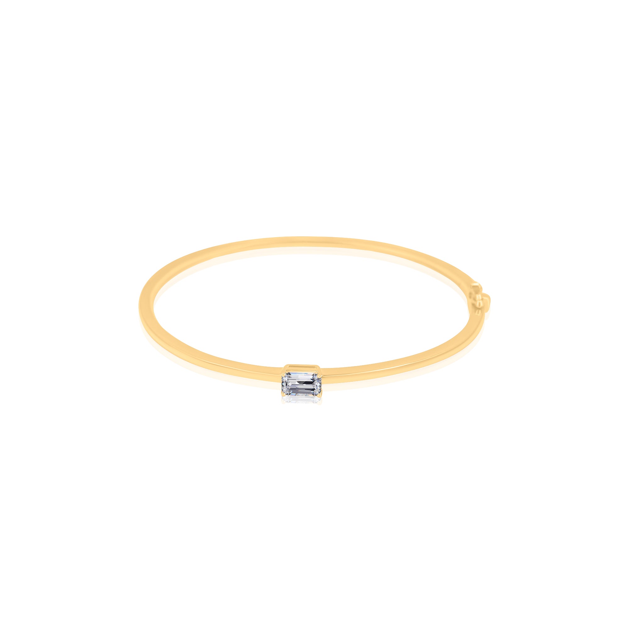 This Gold Lab Grown Emerald Diamond Bangle is a modern heirloom — sleek, minimal, and crafted to make every day feel elevated. A bezel-set emerald-cut lab diamond sits at the center of a polished 14k gold bangle, creating a clean, sculptural silhouette that shines on its own or stacked.