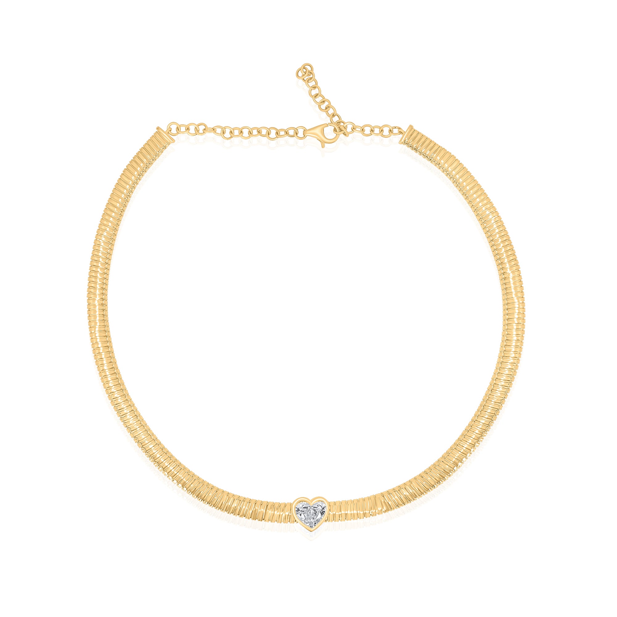 A brilliant heart-shaped lab-grown diamond sits at the center of a ribbed 14k yellow gold collar — a bold yet timeless piece designed to sit beautifully on its own or layered with your everyday chains.