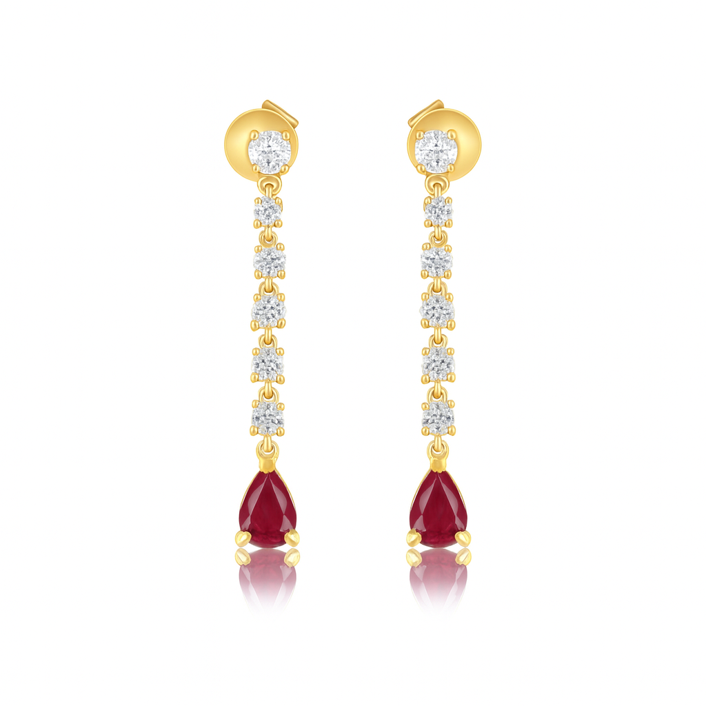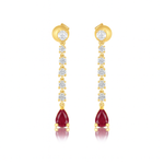 These Gold Diamond Drop Ruby Pear Drop Earring features diamonds and pink sapphire set in 14KT Yellow Gold.