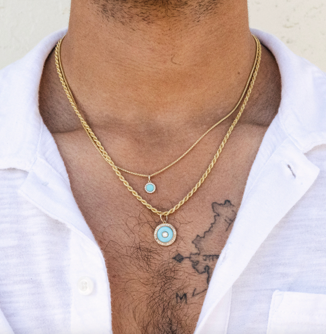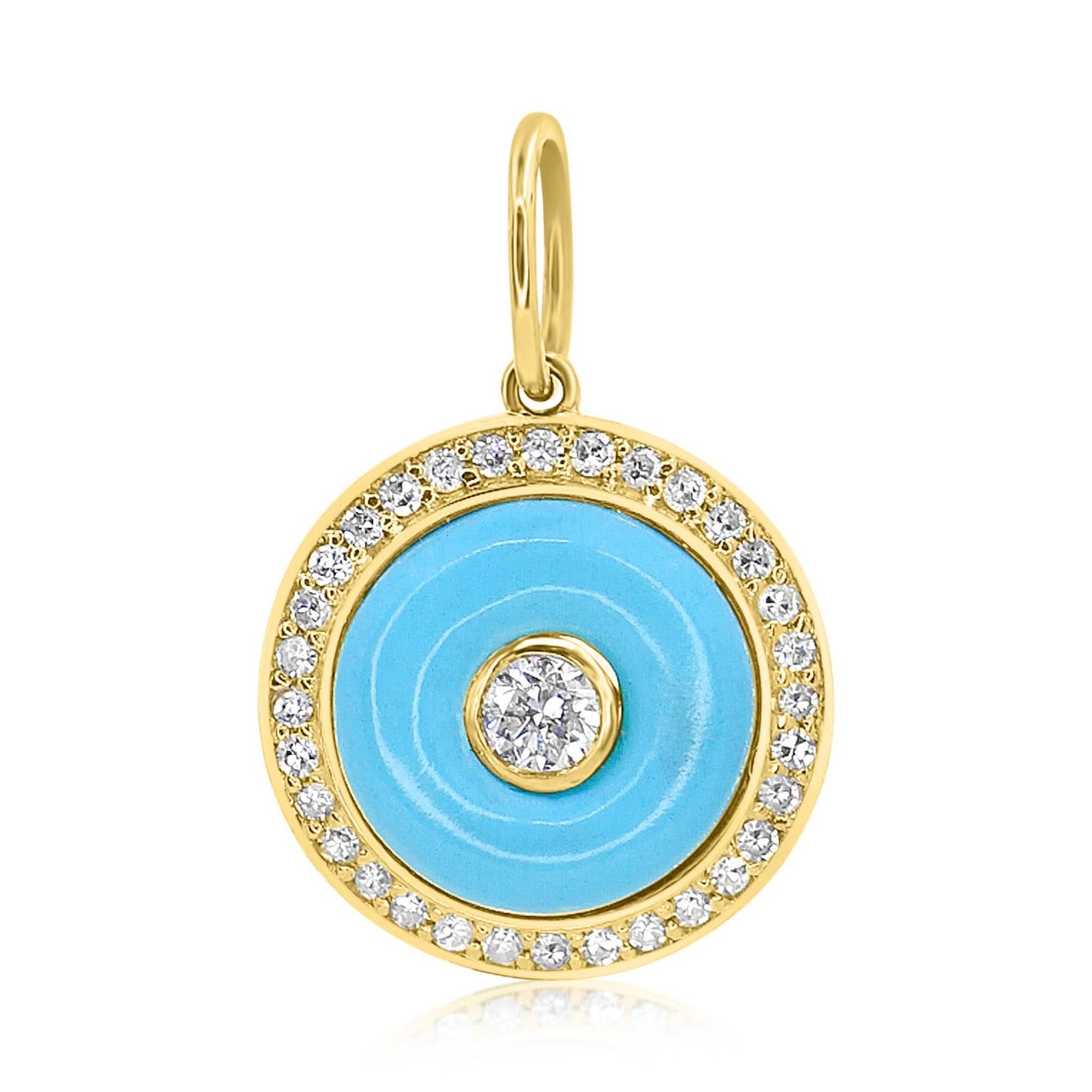 This Gold Diamond Round Turquoise Pendant features diamonds and turquoise set in 14k Yellow Gold.